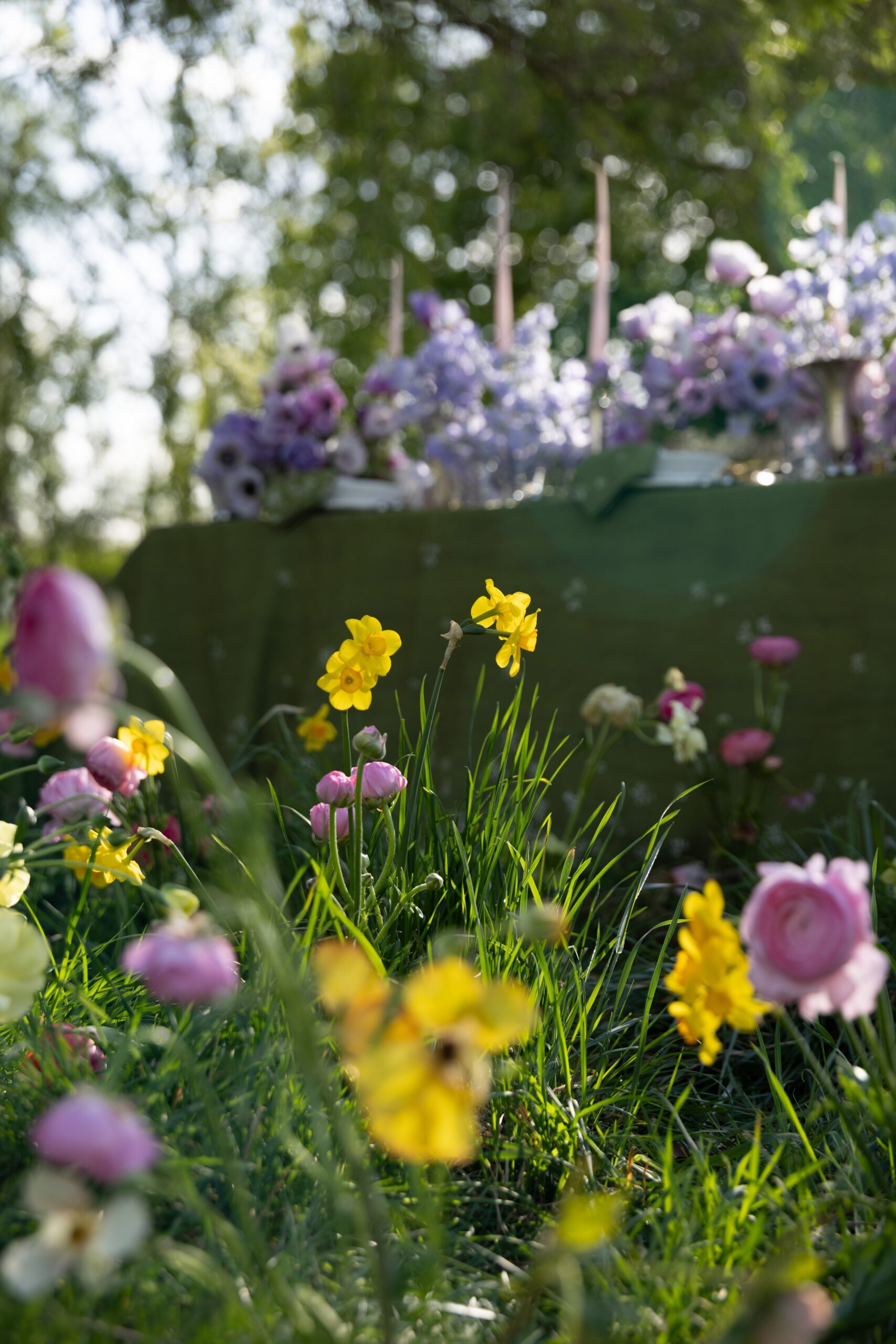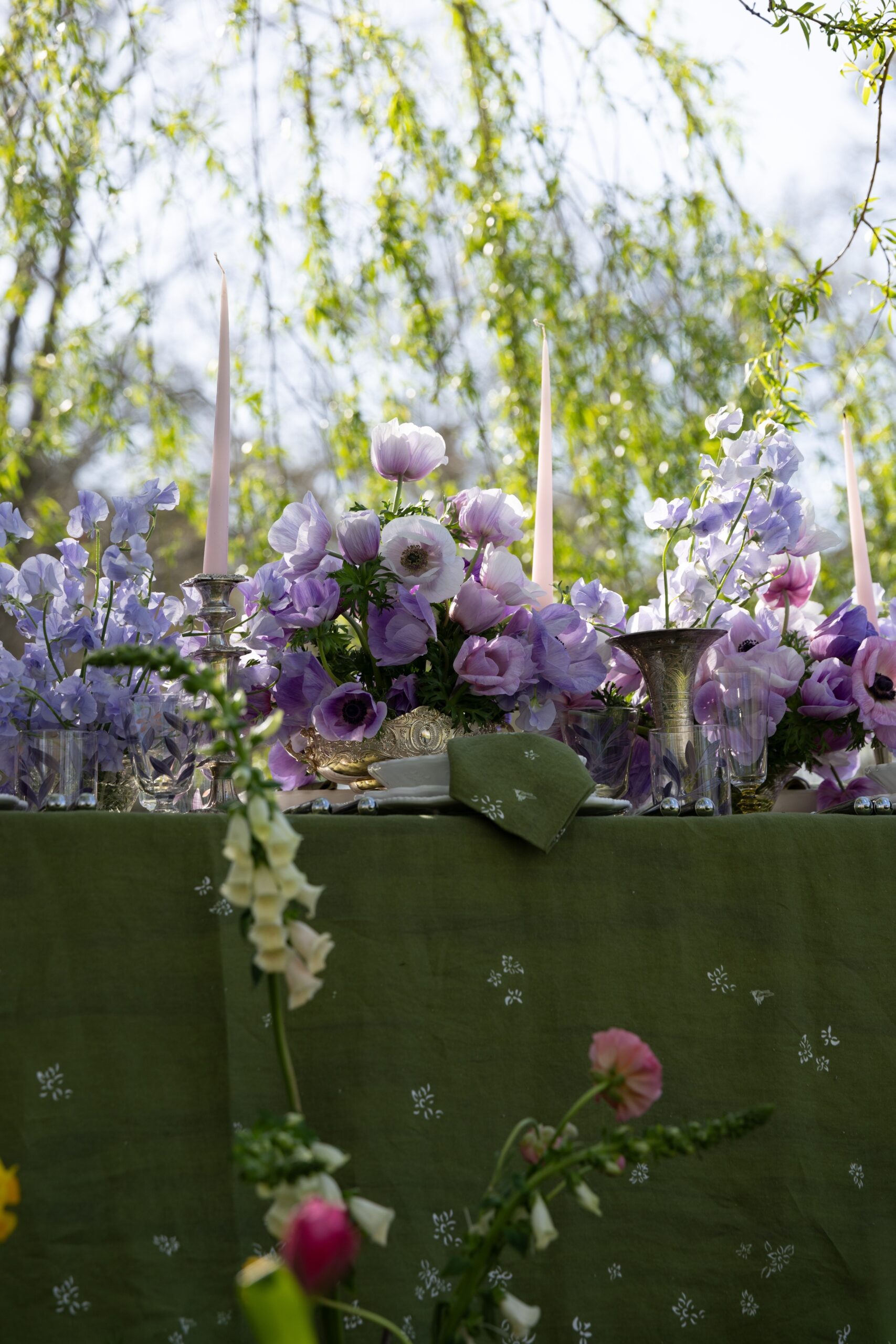 There is a special kind of magic that can be captured in a design when all the senses are invited in. Scented sweet peas and sculptural anemones dance under the dappled light of the ancient willow, the perfect setting for lunch in the spring sunshine.