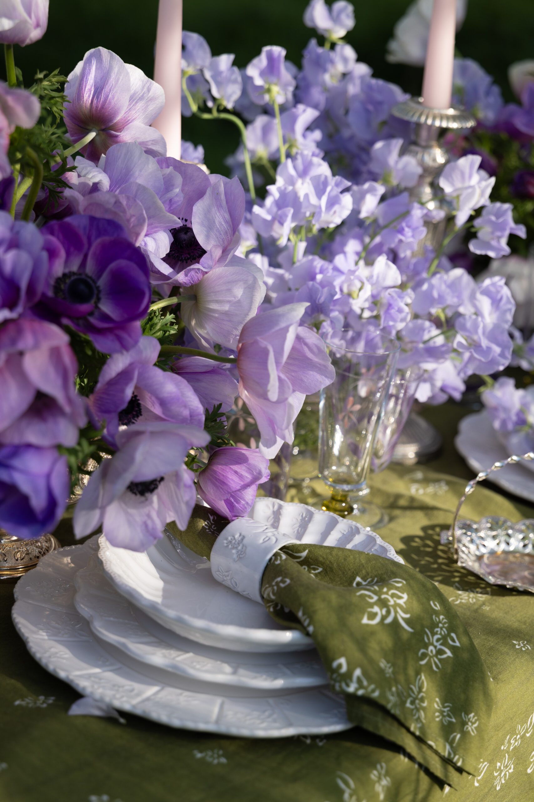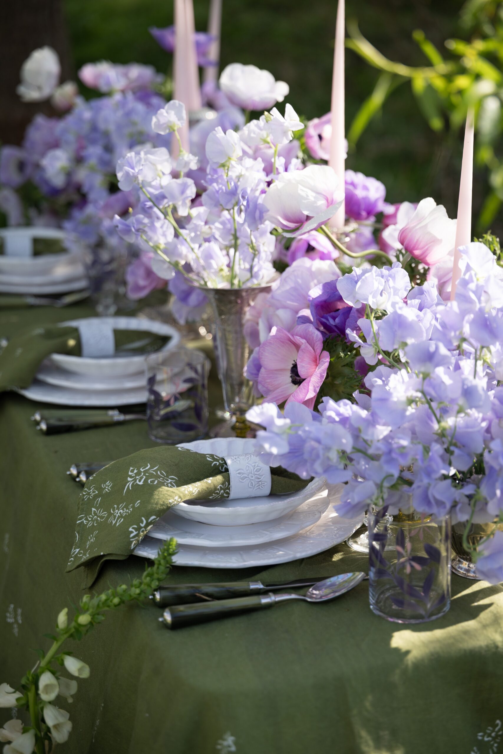 A truly divisive colour, purple is not often requested by our clients but when embraced thoughtfully, it can be deliciously refreshing. For this spring scene, we decided to celebrate the magic of purple by using seasonal ingredients in only this colour scheme against a layered backdrop of lush greens, both on and around the table.