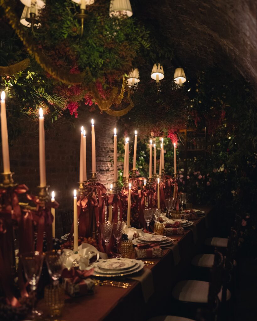 Straight out of a renaissance still life, the soft flicker of candlelight cast golden hues over bow covered candelabras and waves of festive florals that flow down the tables.
