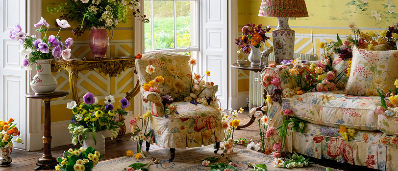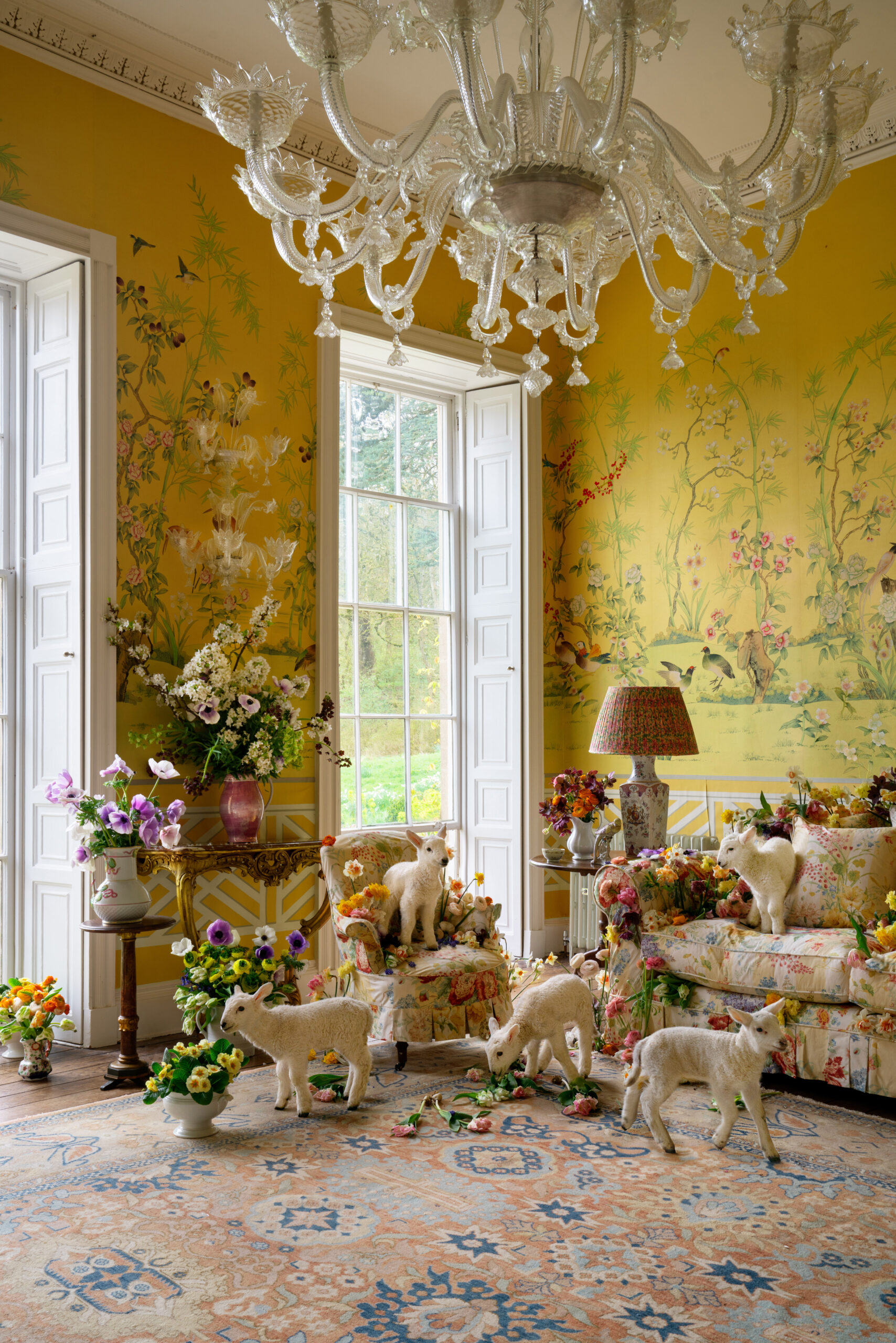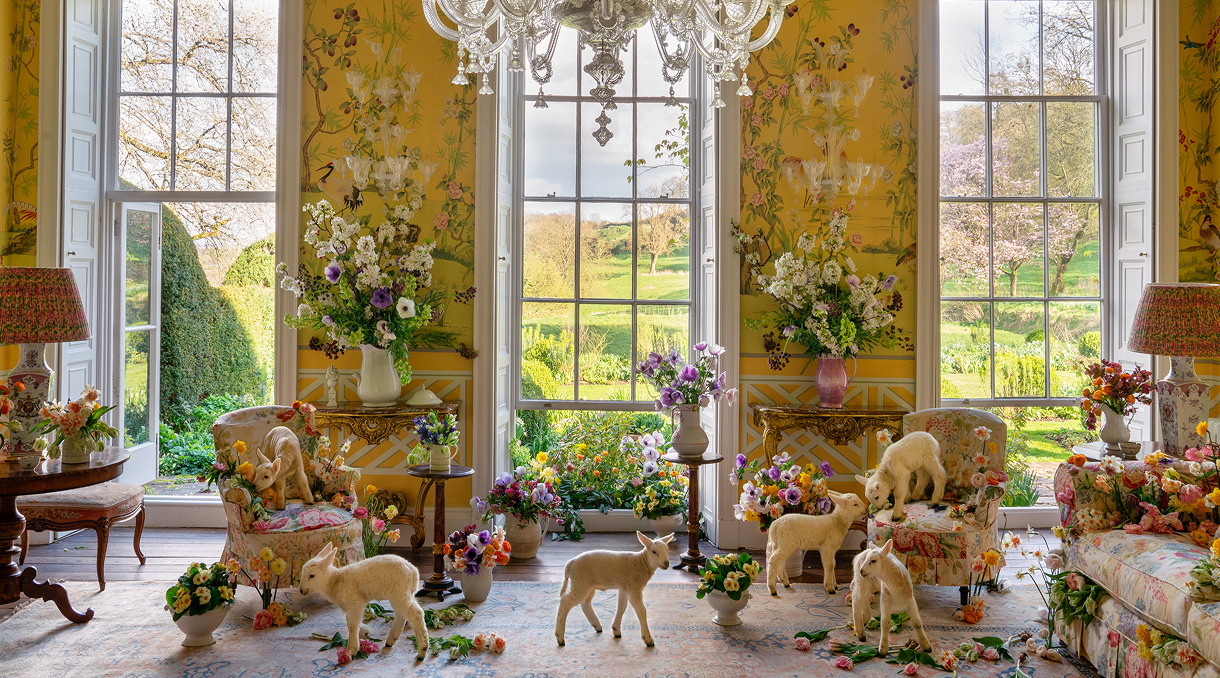 At Wiltshire’s stately Salthrop House, our ode to spring bursts forth in full bloom. A colourful garden brims with vibrant parrot tulips, daffodils, anemones, and muscari while a flock of lambs prances on the Sophie Conran sofa, covered in Colefax and Fowler’s Berrington chintz