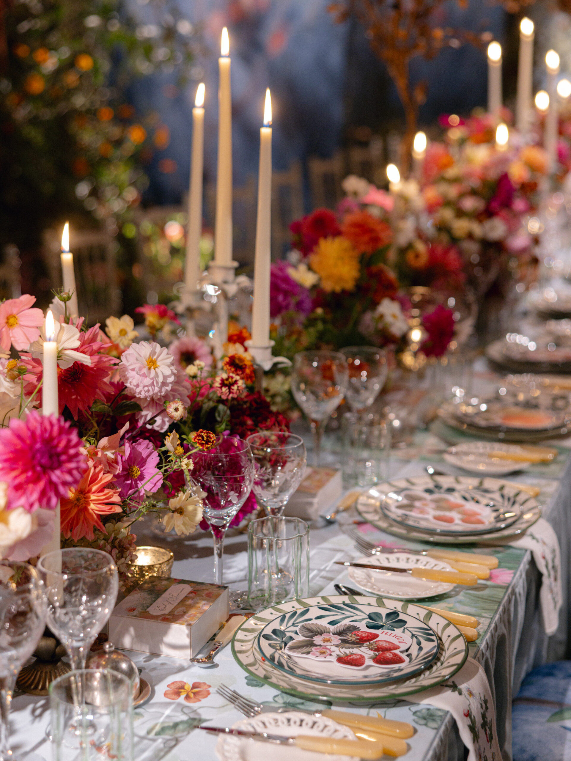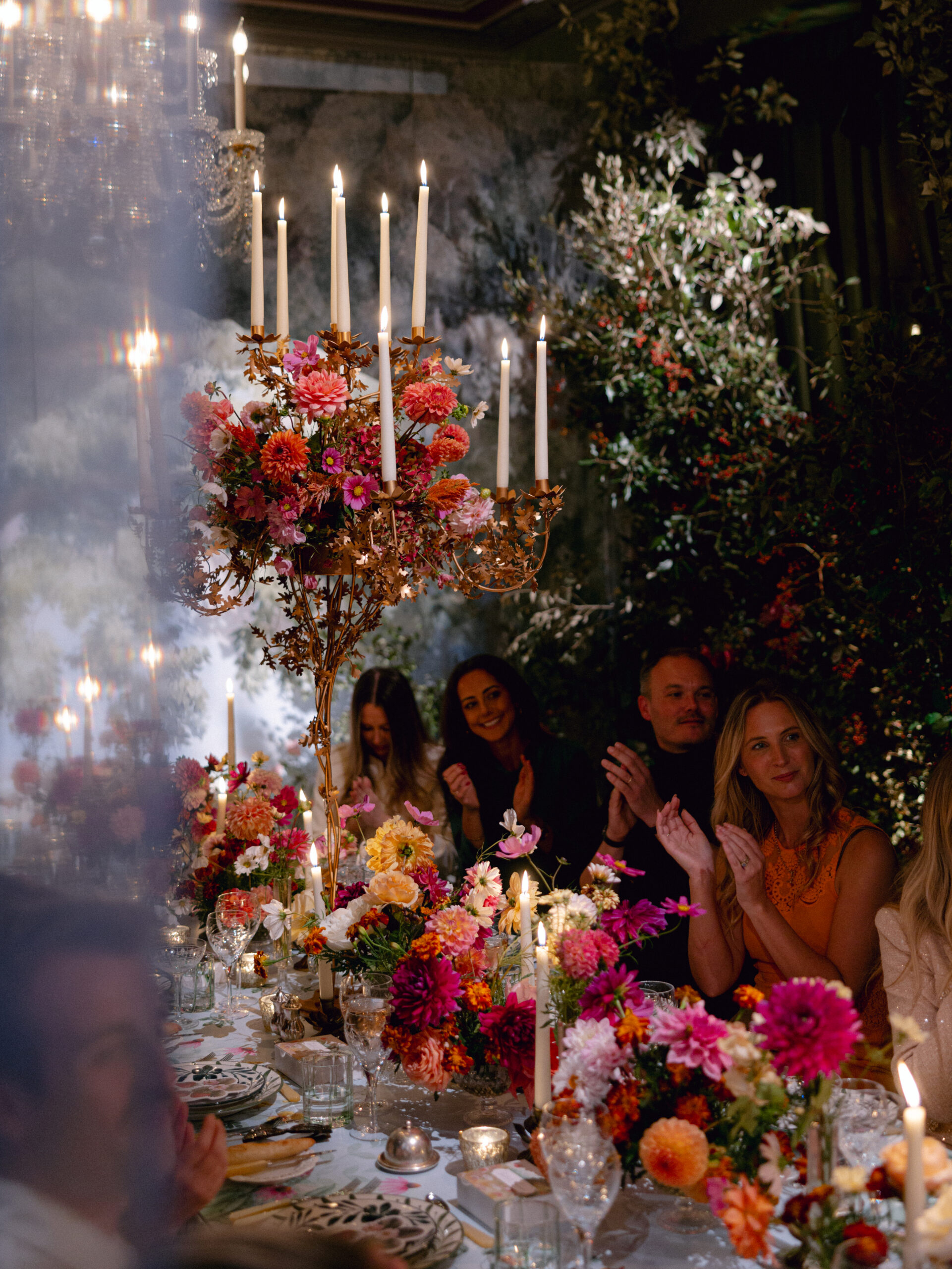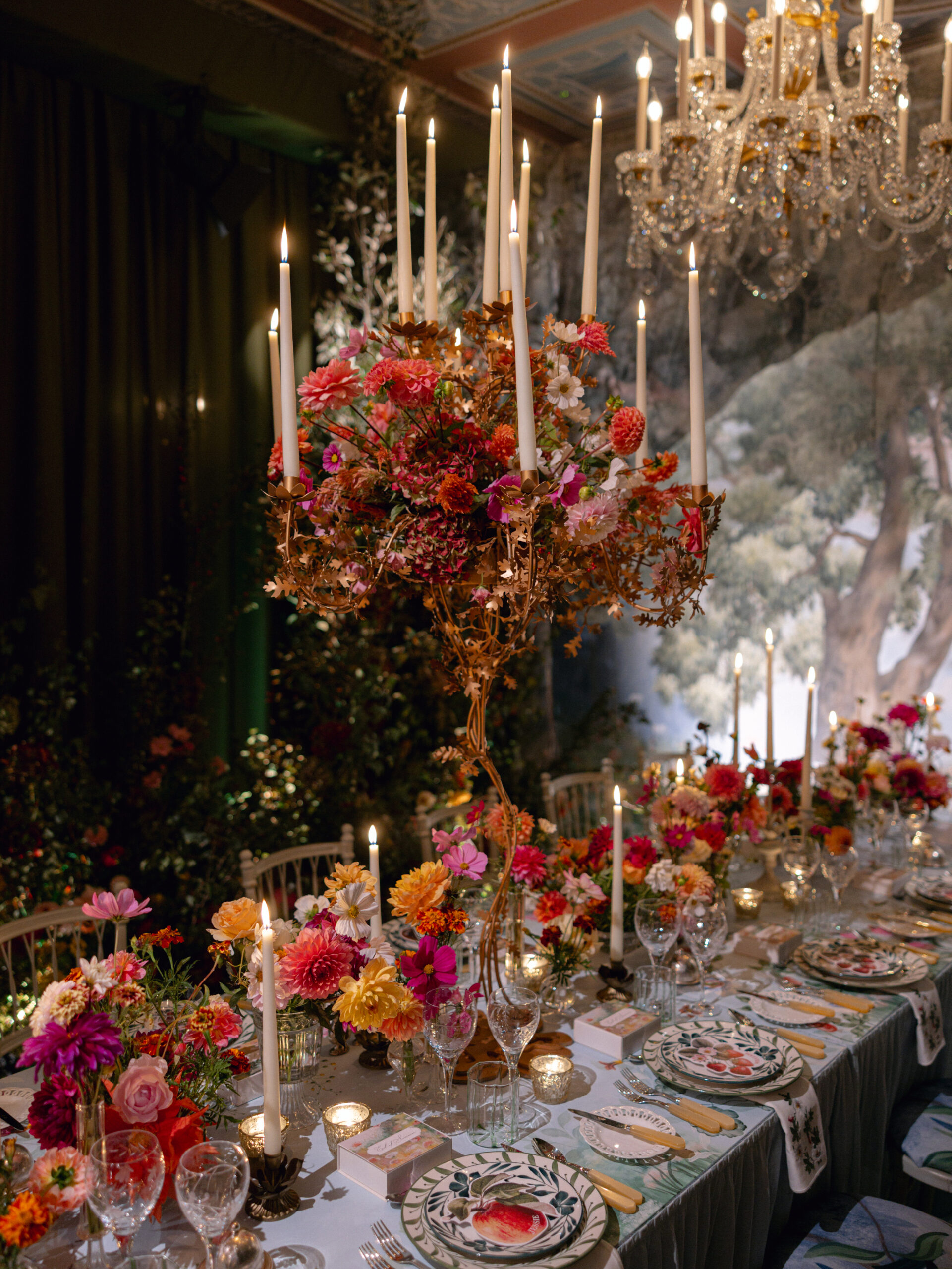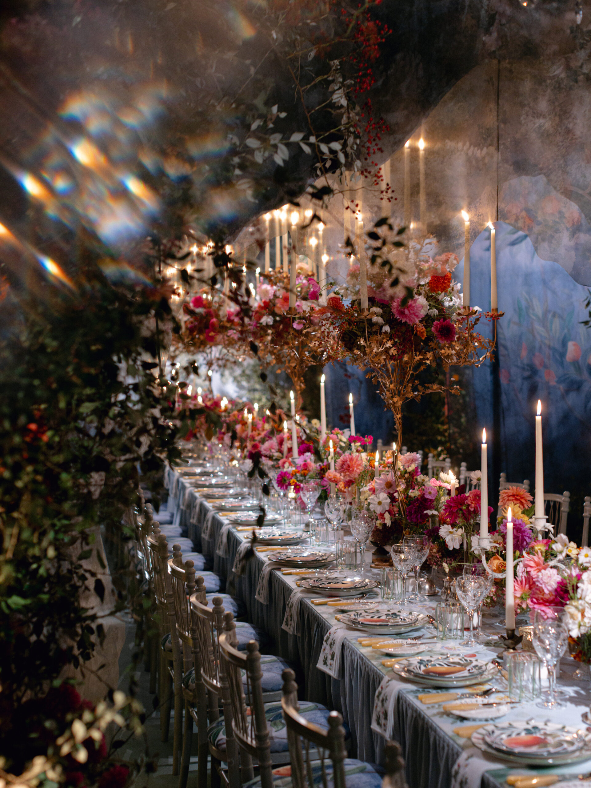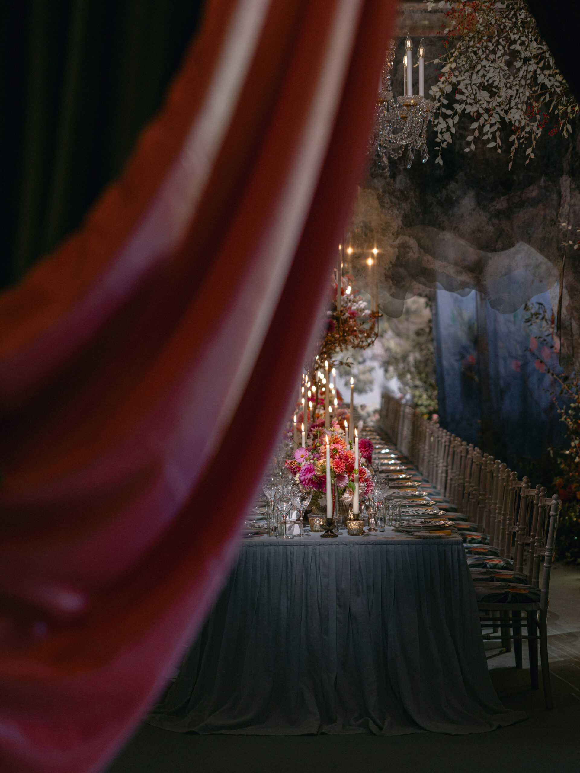 Inspired by a lifelong love of ballet - the harmony of movement, light, and fabric - this End of Summer Party marked the first public unveiling of our Ballet set designs. It is a celebration of scenic storytelling and the artistry of events creators, who conjure moments of magic that appear and vanish in an instant, but live on forever. For the first time, guests dined within a living stage: flowing silks, trees, and flowers that move with the space, blurring the line between set and celebration. Every detail - British-grown blooms, hand-painted murals, bespoke fabrics and embroidered accents - were a;; crafted to ignite the senses and tell a story of the ballet.